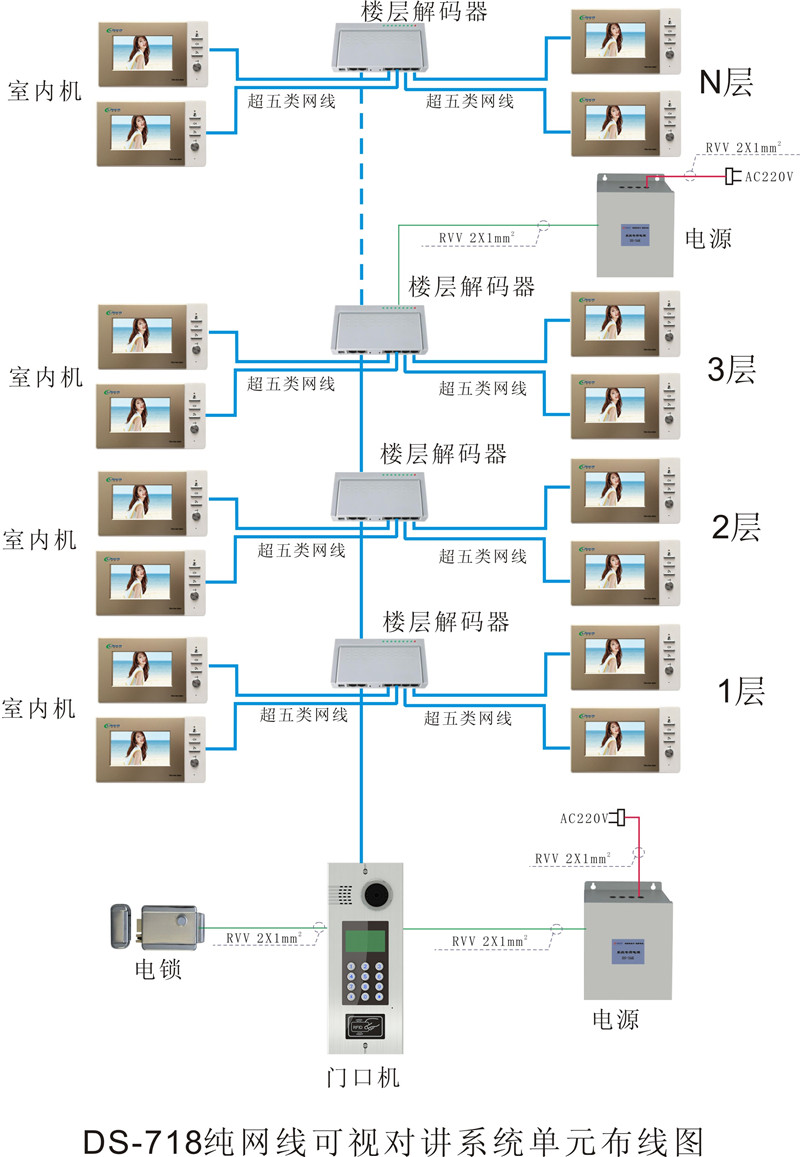• DS-808二線制數碼非可視對講系統布線圖(樓層解碼)